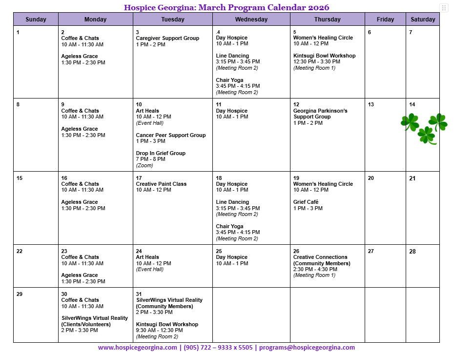 Funding & Accessibility:All programs are generously funded by the United Way of Greater Toronto and are offered free of charge to Hospice Georgina clients and volunteers.